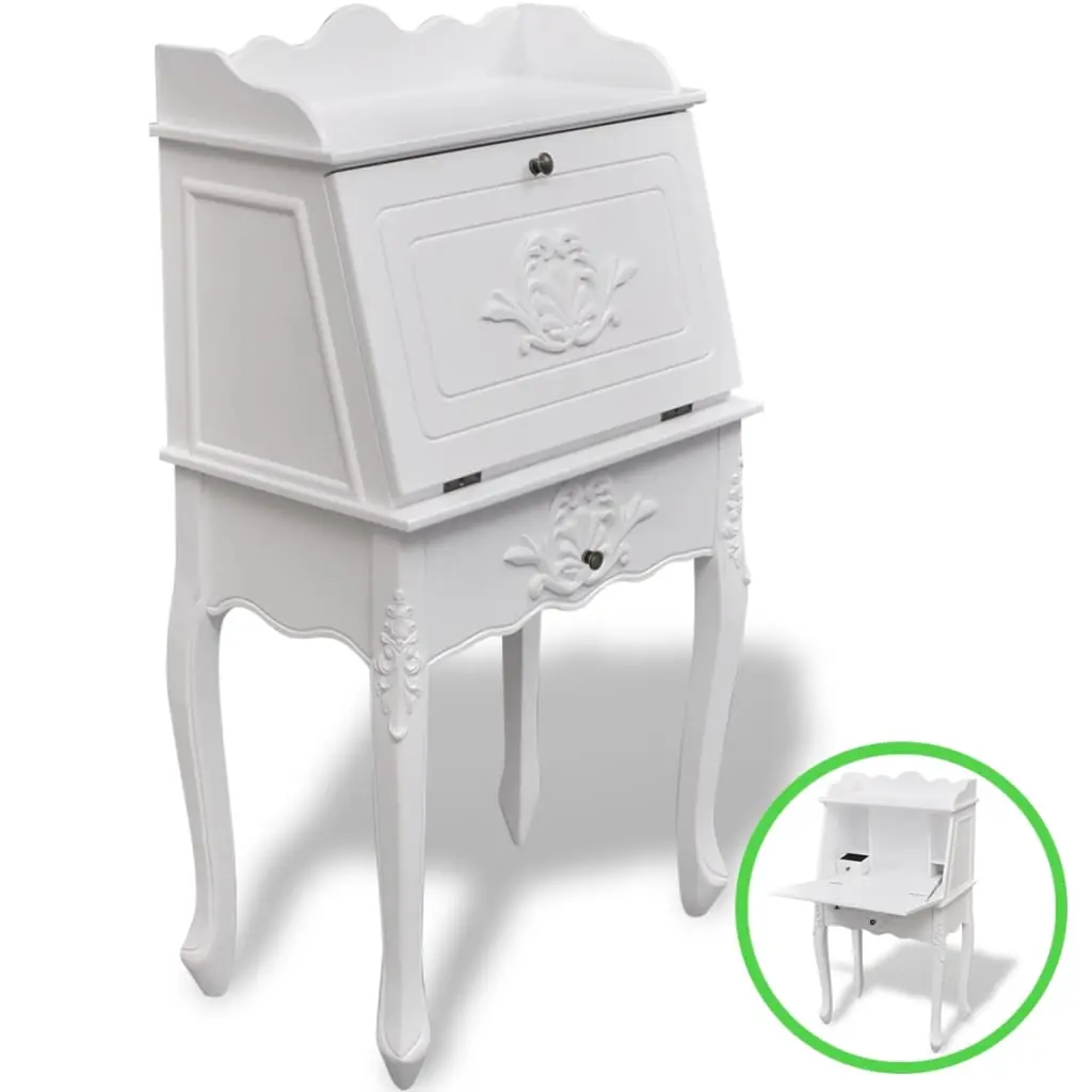 Biroul de lucru are blatul cu balamale, acesta fiind și ușa dulapului. Având un sertar mic și rafturi, acest birou de scris are un spațiu amplu de depozitare pentru creioane și pixuri, obiecte de papetărie și mărunțișuri.