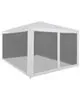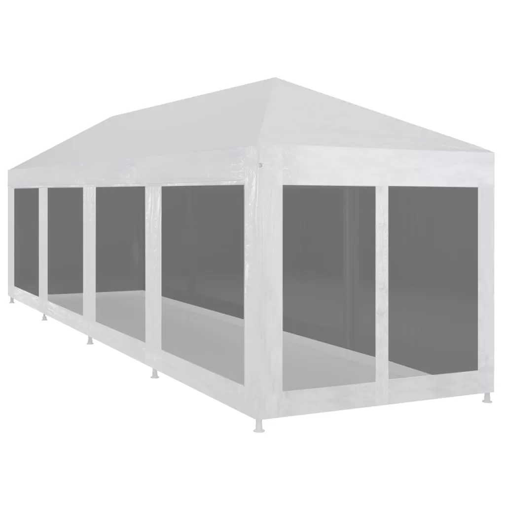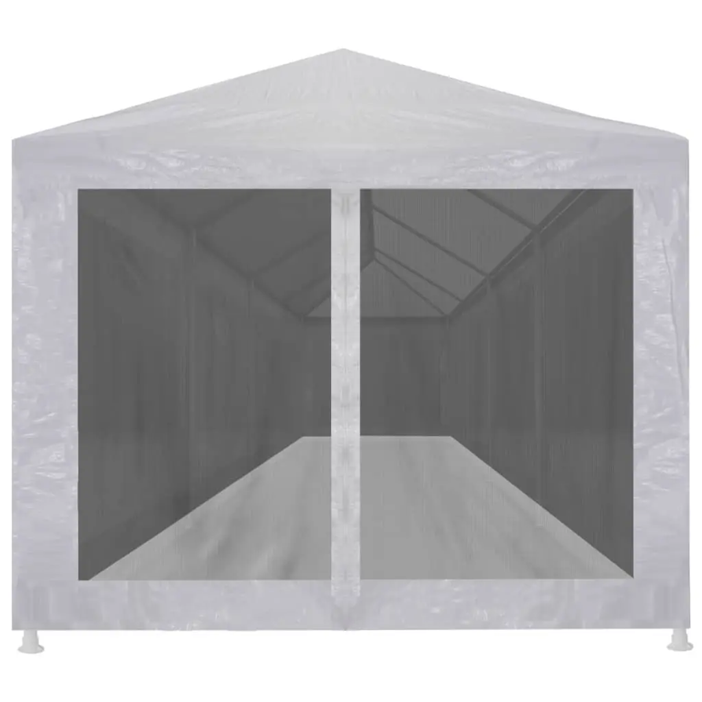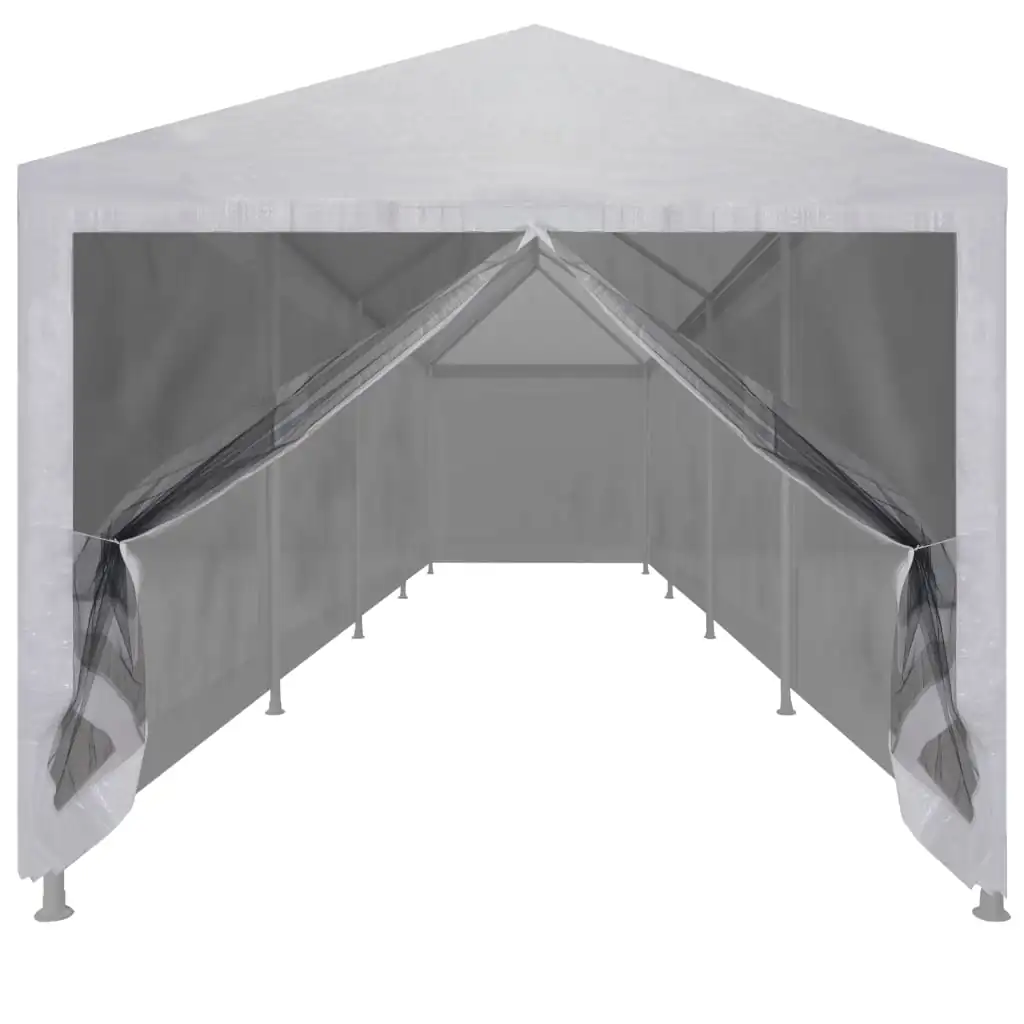 Fabricat din oțel foarte rezistent, vopsit electrostatic, acest cort pentru petrecere este extrem de durabil. Acoperișul este fabricat din polietilenă de calitate superioară, ceea ce îl face rezistent la apă și UV. Cortul are zece pereți laterali din plasă, care vă protejează de insectele nesuferite. Doi dintre pereții laterali sunt prevăzuți cu intrare cu fermoar pentru acces ușor. Cortul este ușor de instalat cu accesoriile de montare incluse.