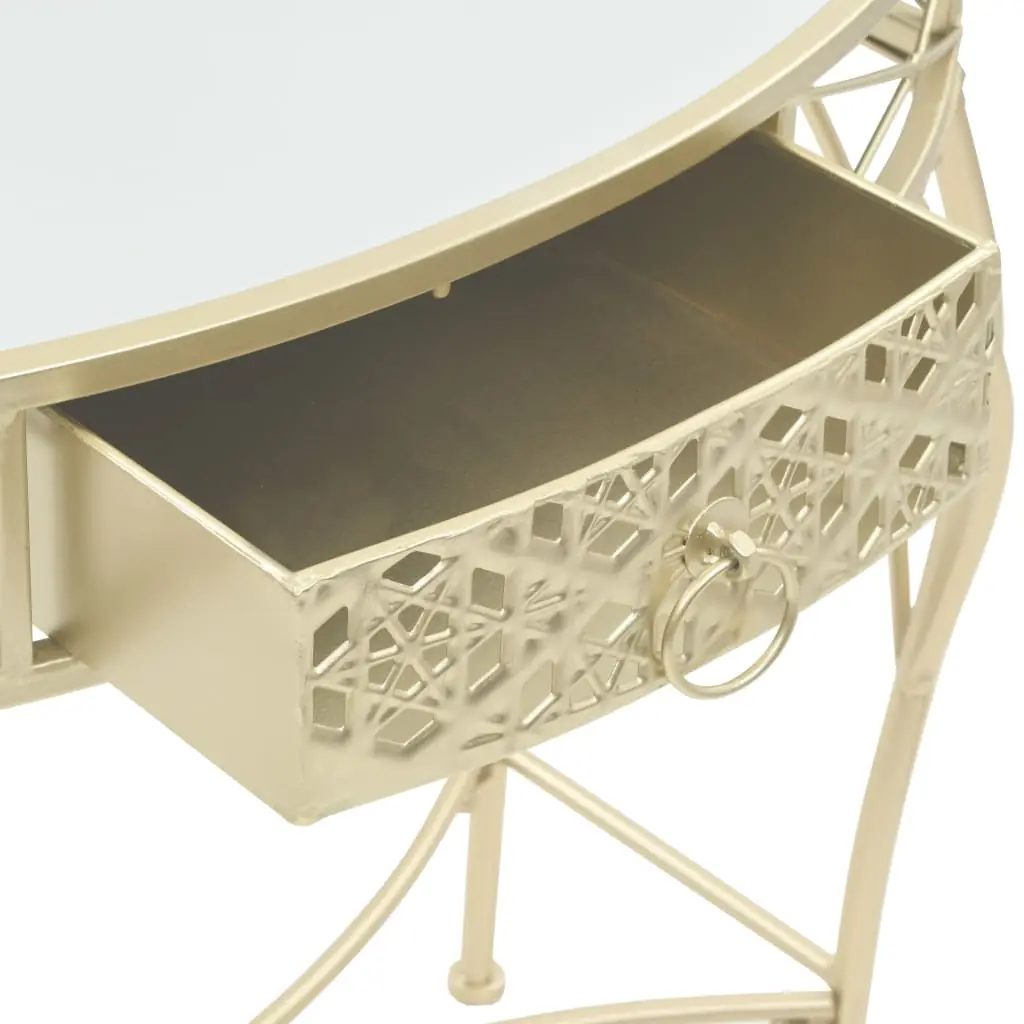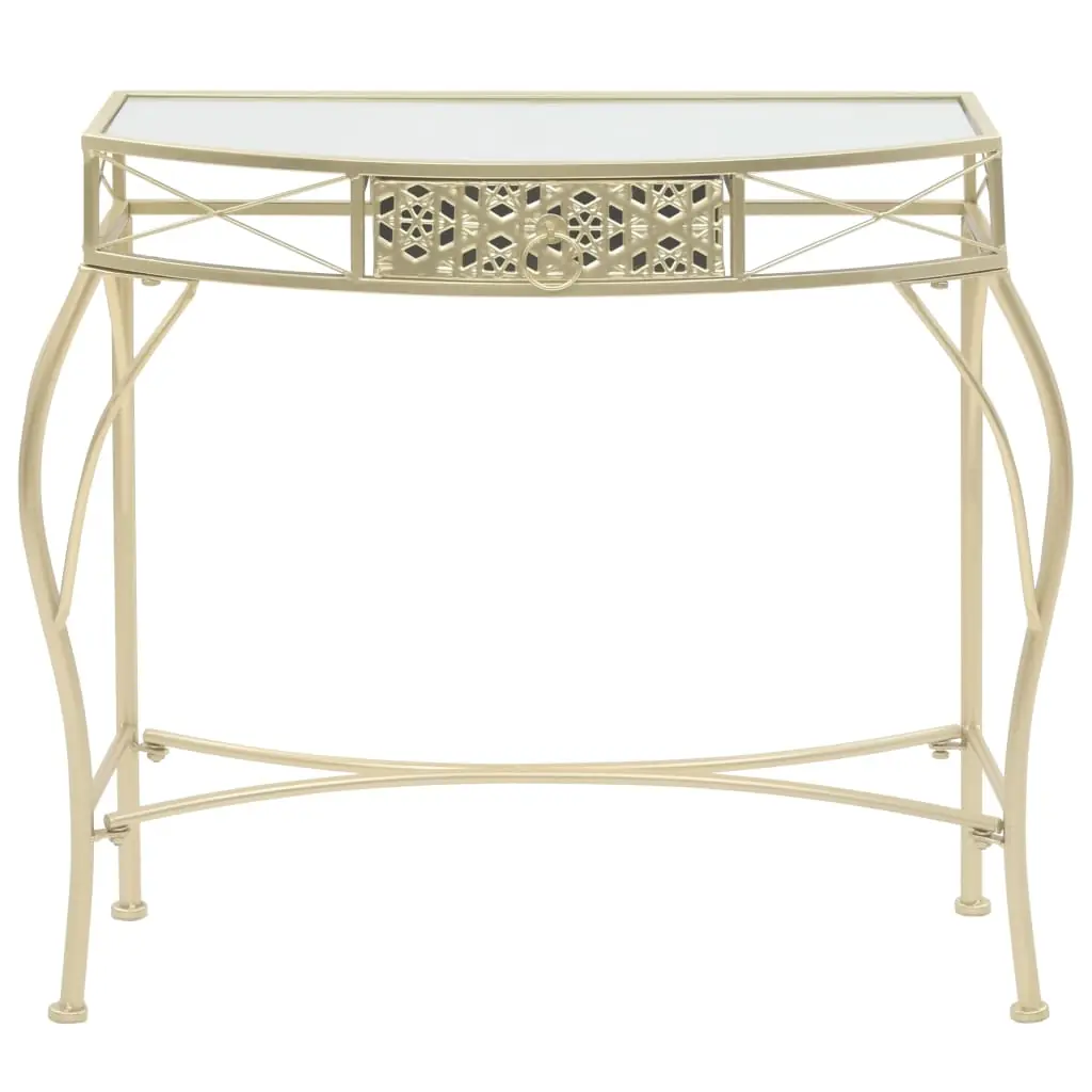Această masă este realizată dintr-un cadru metalic și un blat din sticlă, fiind stabilă și ușor de curățat. Masa laterală are un sertar împodobit cu detalii rafinate, care conferă mesei un aspect antic și creează un aer de eleganță în casa dvs. Acest articol este ușor de asamblat.