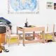 Acest set este realizat din panouri MDF, având colțuri ușor rotunjite, care sunt robuste și protejează copiii împotriva rănirilor cauzate de colțuri și margini ascuțite. Masa multifuncțională are un blat mobil cu două fețe. Una din fețe este o tablă albă, iar cealaltă este o tablă de scris cu cretă. Incluzând o zonă de joacă încorporată și servind drept compartiment de depozitare, este perfectă pentru copii să ia masa, să se joace și să își depoziteze jucăriile, contribuind la prevenirea împrăștierii jucăriilor, a vărsării băuturilor și răsturnării gustărilor de pe masă.