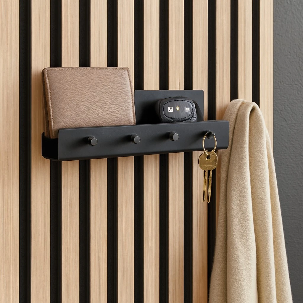 Polita si cuier Wilma, pentru panouri riflate, este un accesoriu modern și practic, creat pentru a completa panourile acustice și a oferi un spațiu suplimentar de depozitare sau expunere. Designul său minimalist și materialul metalic rezistent îl fac ideal pentru orice ambient – fie că este vorba de living, birou sau spații comerciale. Dimensiuni: 22 × 9 × 5 cm. Material: metal durabil, finisaj modern.