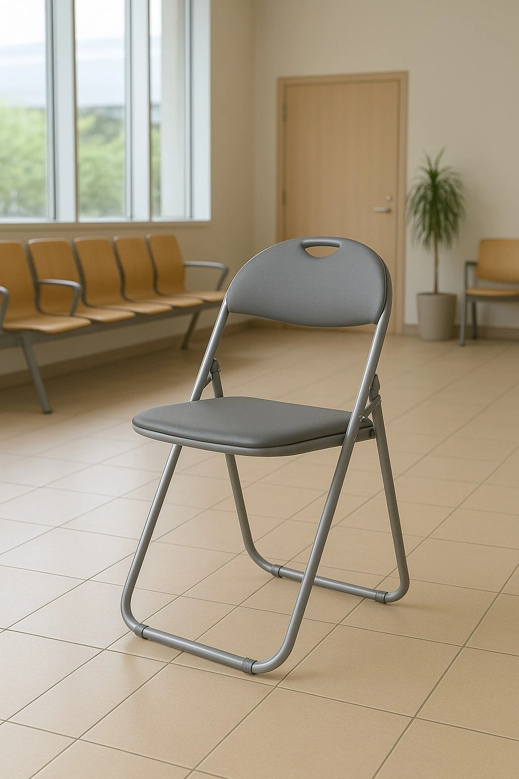 Datorită posibilității de pliere, acest scaun poate fi ușor manevrat și depozitat, se poate chiar și agăța pe perete, astfel încât să nu ocupe mult spațiu atunci când nu este utilizat. Șezutul este capitonat cu burete de 2 cm grosime, pentru a asigura confort în utilizare, iar tapițeria din PVC conferă rezistență.