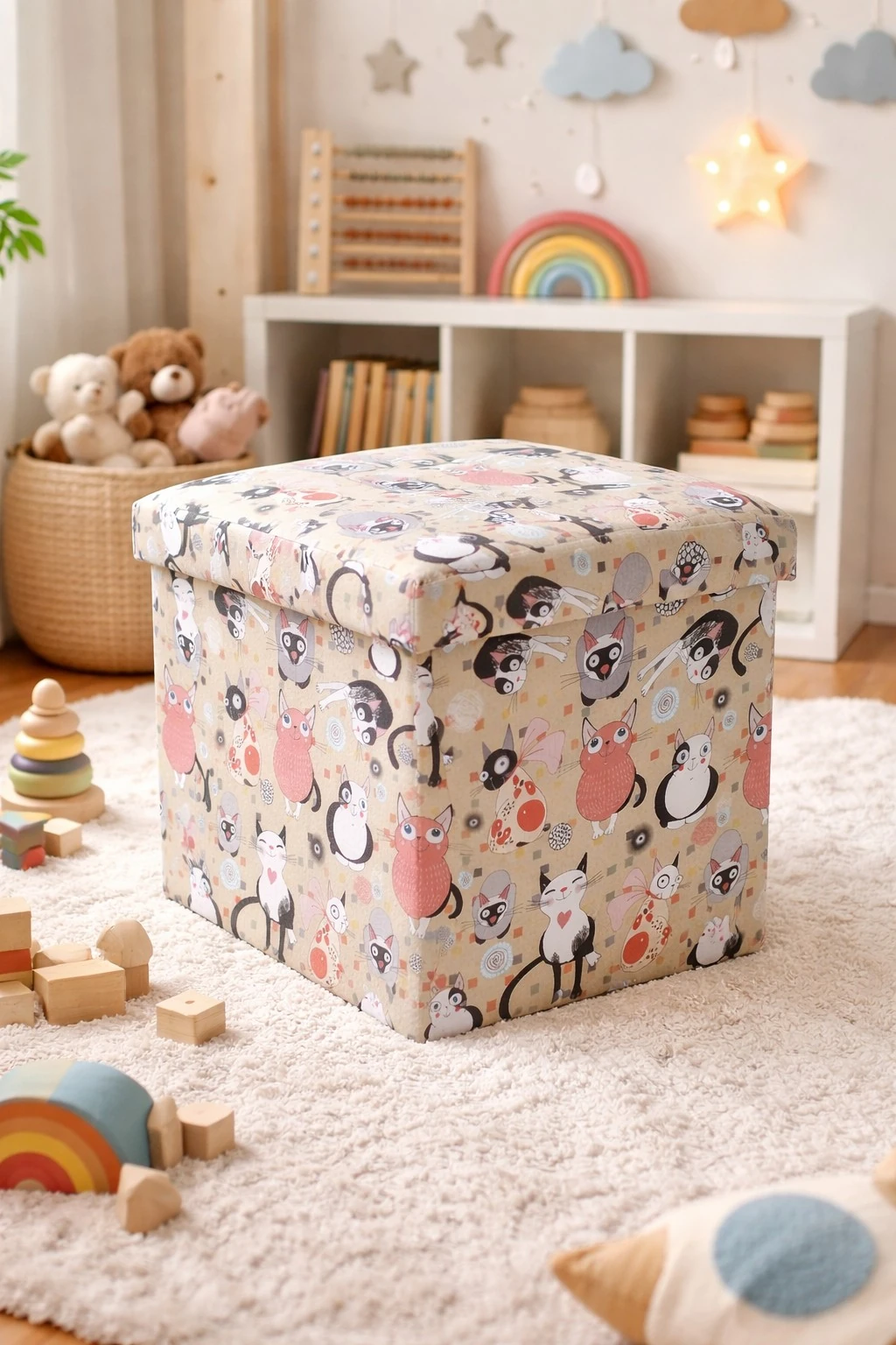 Cubul este pliabil, astfel ca nu ocupă mult spațiu, este ușor de transportat și depozitat. În interiorul taburetului tip cutie cu capac puteți păstra jucării, reviste, cărți, pantofi, în limita dimensiunilor sale, respectiv 38 cm lățime, adâncime și înălțime. Astfel, dispuneți de articole necesare la îndemână și de un spațiu eficient organizat.